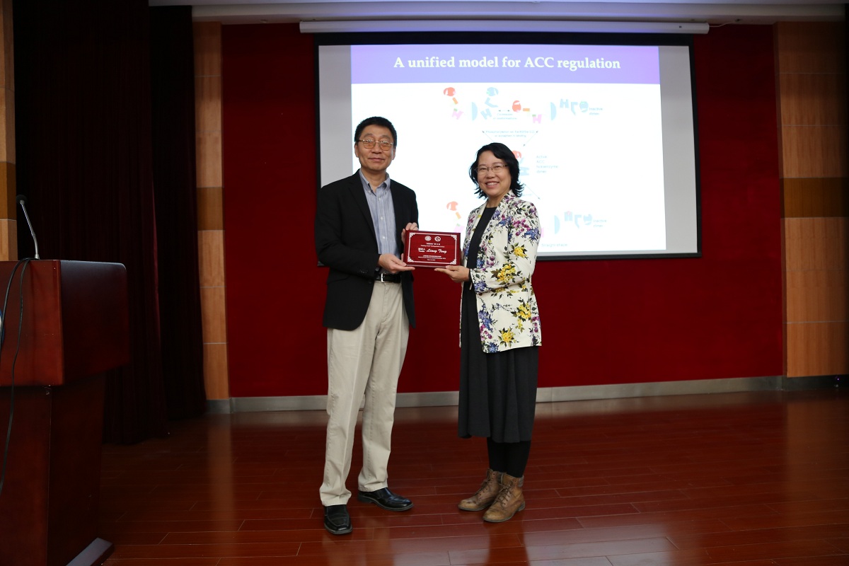 在提问环节,参会教师就代谢酶的别构调节与药物开发等问题与Liang Tong教授进行非常热烈讨论。讨论过程中,Tong教授例举了激酶抑制剂的活性位点药物开发,比较了通过别构调节作用开发靶向药物的不同点和优势。也与在场老师详细解释了ACLY活性位点氨基酸残基参与催化过程的化学机理。