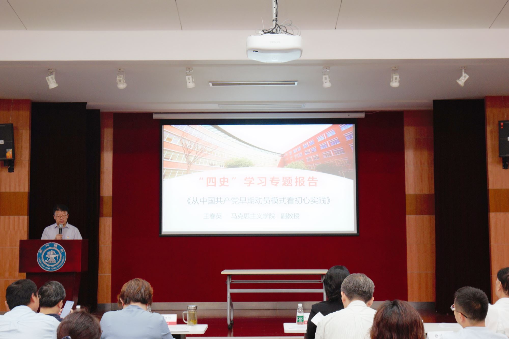 为深入贯彻习近平总书记关于深入学习党史、新中国史、改革开放史、社会主义发展史的重要指示精神,认真落实学校关于推进“四史”学习教育的工作安排,9月29日下午,新利体育举办“四史”学习教育专题辅导讲座,邀请学院马克思主义学院王春英副教授以《从中国共产党早期动员模式看初心实践》为题,为学院党员代表授课。讲座由学院党委书记嵇绍岭主持。