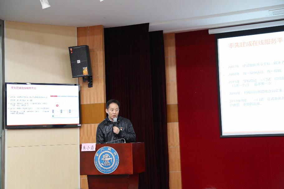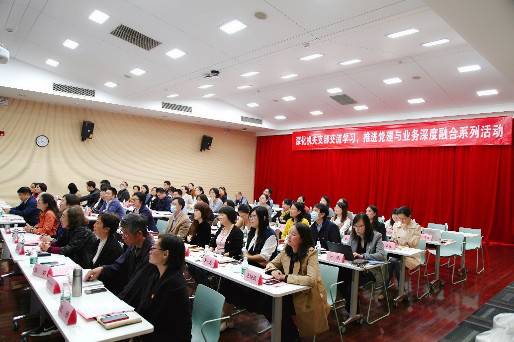 我院机关党支部书记刘璐介绍了系列主题党日活动开展情况,通过支部联建,加强工作交流,资源共享,思想共进。随后,网络信息中心数据业务部副主任朱小磊作题为“党建引领、创新赋能、服务师生”的报告,介绍了“交我办”主要业务,分享了如何让信息化更好地服务师生。与会人员就“交我办”的各个功能模块进行了充分的交流和讨论。