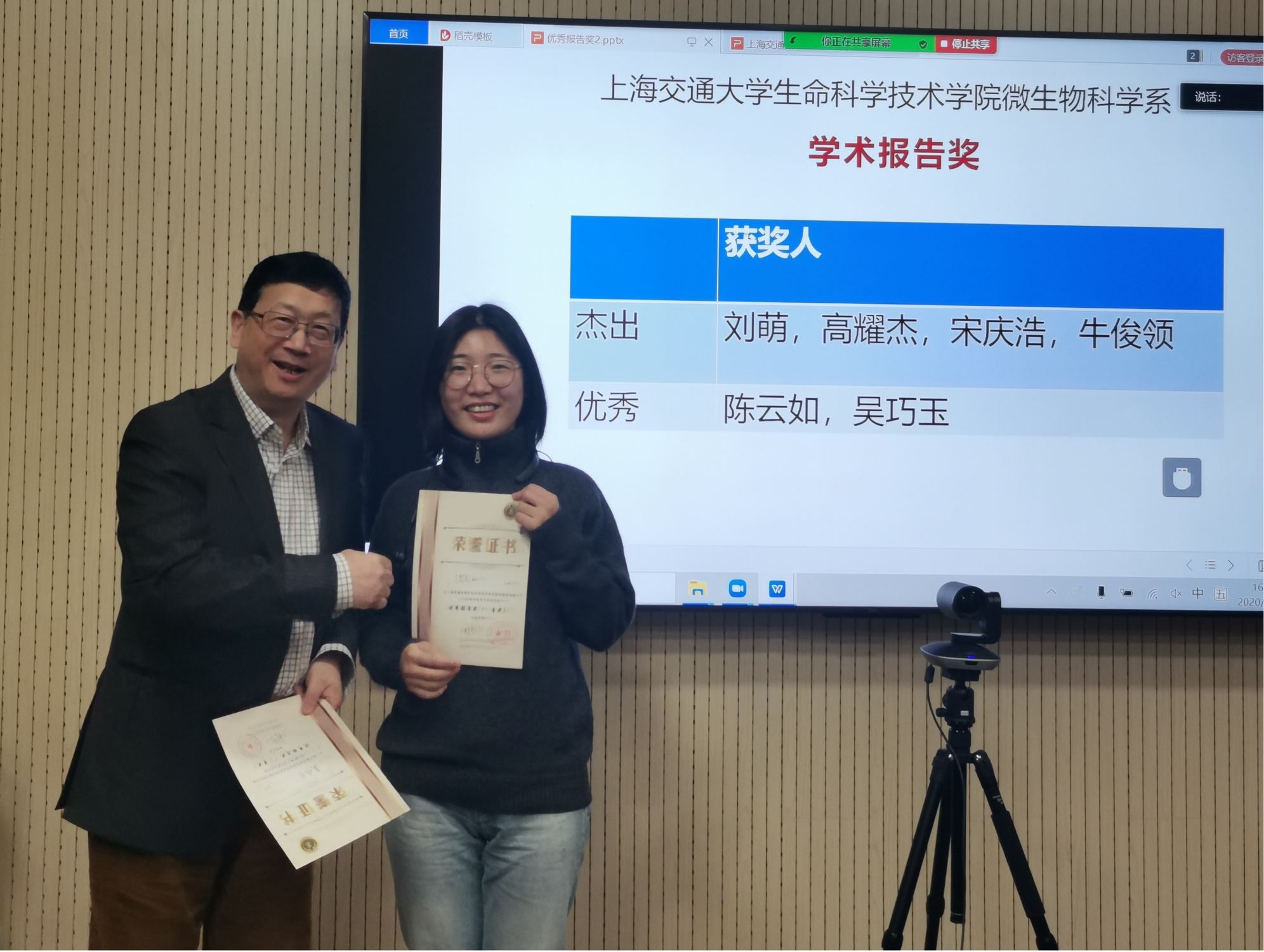 经过交流会专家评委的认真评选,交流会产生6名优秀报告奖,系主任周宁一教授为获奖同学颁发了证书,以示鼓励。本次微生物科学系博士生学术交流会的顺利举办,为研究生提供了一个开放互动的交流平台,彰显了生科院浓厚的学术氛围。