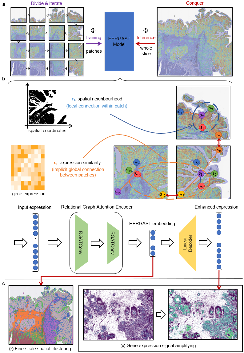 HERGAST的核心思想是采用“分而治之”的策略。HERGAST将整个组织切片分割成可处理的小块,在这些小块上迭代训练一个先进的模型,然后在整个切片上进行推断,并基于模型的输出进行下游分析。我们将这个策略框架称为“分-迭-治”(Divide-Iterate-Conquer, DIC)。为了解决数据分割可能导致的“过平滑”问题,HERGAST构建了一个异构图网络,能够包含局部和全局的空间关系。该遗址图网络不仅考虑了空间上相邻的“点”(spots)之间的关系,还利用了基因表达谱的相似性来建立不同“点”之间的连接,从而让信息在训练过程中可以流动,使得模型能够捕捉到全局的模式,并通过交叉注意力机制实现自适应信息融合。模型输出的低维嵌入可用于结构识别,解码器则增强原始数据中的关键表达信号,可以用来增强关键的空间模式(图1)。