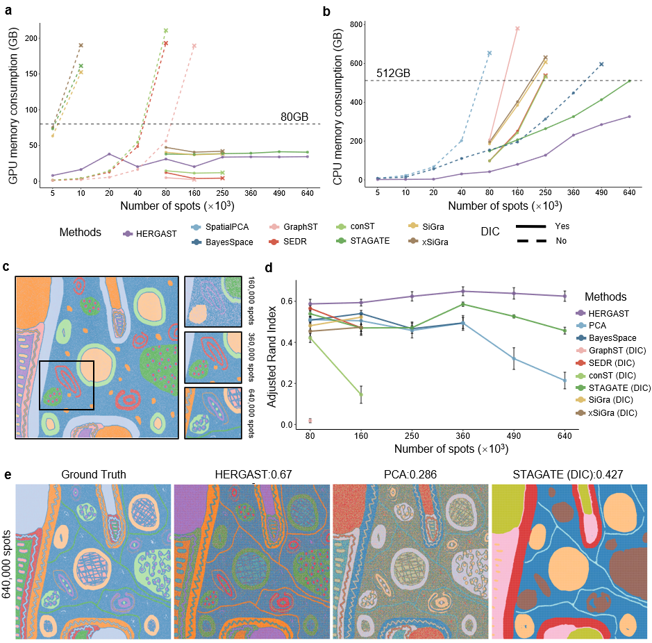 大量的数据模拟试验表明,HERGAST在不牺牲性能的前提下,有效减少CPU内存占用,支持超大数据集处理。相比其他方法,HERGAST的ARI等指标平均提升10%以上(图2).