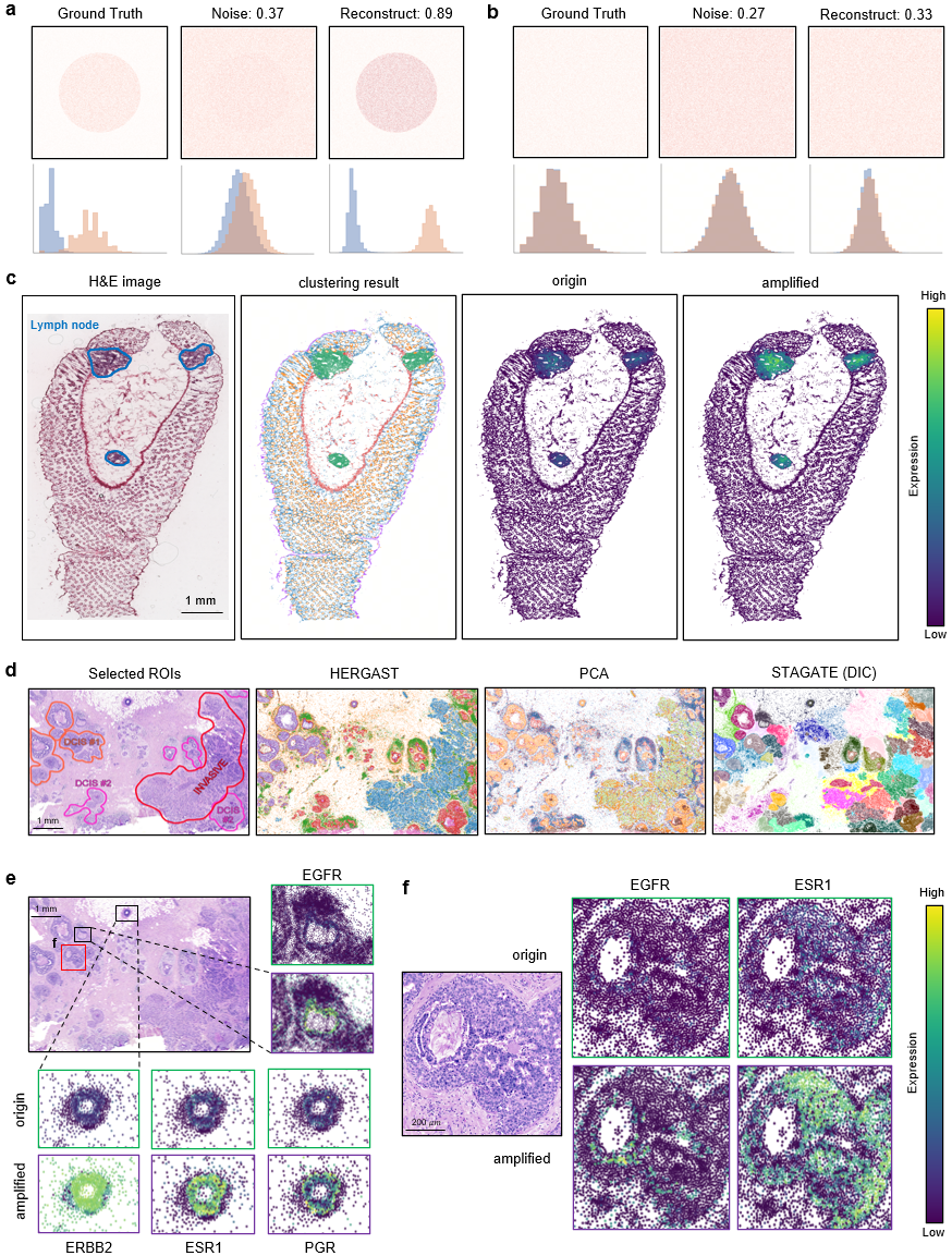 高分辨率的ST数据(如Xenium)虽然优势明显,但也存在高强度信号过度饱和,可能掩盖低强度生物学信号的风险。HERGAST不仅可以进行空间聚类,其解码器还能重建基因表达谱,从而增强关键的分子特征。我们通过模拟实验证明,即使在加入了大量噪声的原始数据中,HERGAST重建的基因表达值也能在很大程度上恢复原始的空间模式,皮尔逊相关系数从0.37提高到了0.89。