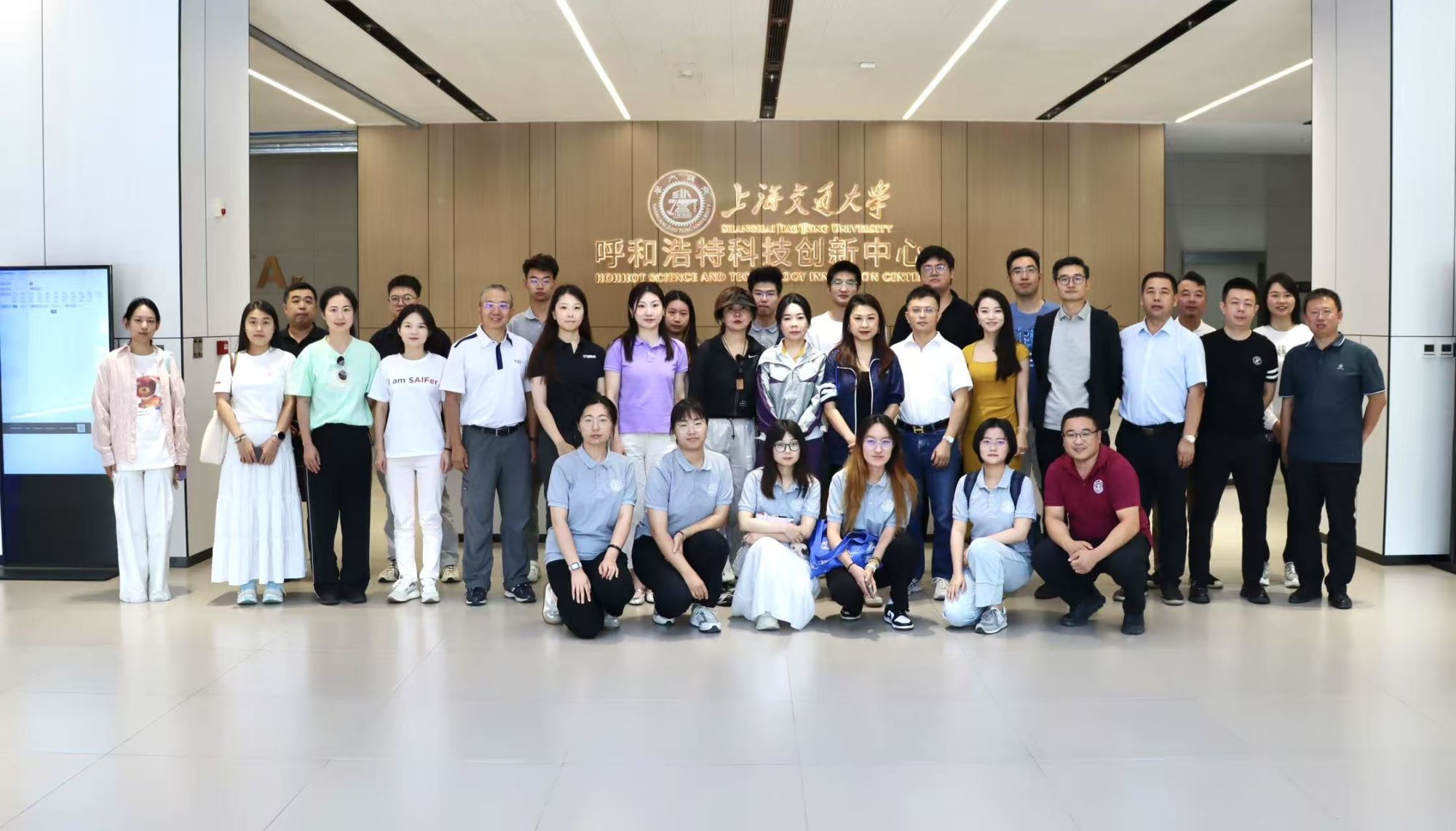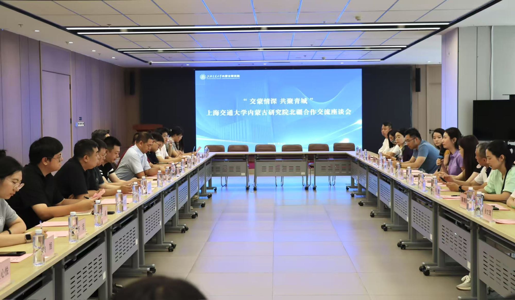 活动最后,实践团一行前往上海交通大学内蒙古研究院,与当地政府、交大内蒙古研究院、交大上海高级金融学院师生共同举行“交蒙情深 共聚青城”上海交通大学内蒙古研究院北疆合作交流座谈会。呼和浩特市非公经济服务中心主任张锐强,市经济技术开发区科技人才局创业专技科科长金鑫,市投资促进局综合业务科副科长包尔呼,内蒙古肉牛产业协会会长、前蒙牛集团副总裁李杰,上海交通大学内蒙古研究院副院长杨竞哲,技术转移部副部长肖志鹏等出席会议。座谈由上海交通大学内蒙古研究人才培养部部长白龙主持。