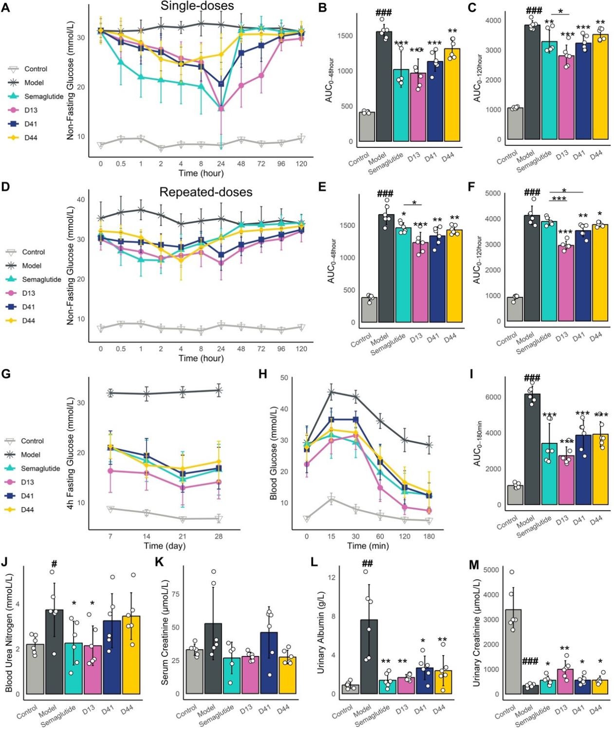 GLP-1RAs的降糖效果:在db/db小鼠模型中,分别采用单次给药和多次给药方案评估GLP-1RAs的降糖作用。单次给药用于观察急性降糖效果,多次给药则用于评估长期及累积降糖效应。此外,还进行了葡萄糖耐量试验(iPGTT)以验证糖耐受改善情况。结果显示,在单次给药、多次给药以及iPGTT试验中,与Semaglutide组相比,D13和D41均能显著降低血糖水平(如图4所示)。