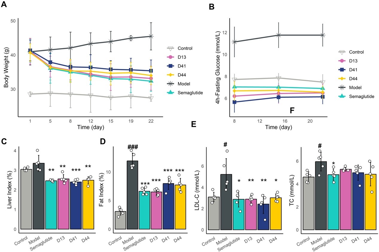 GLP-1RAs的减肥效果:在饮食性肥胖(diet-induced obesity,DIO)小鼠模型中,D13、D41和D44的治疗均导致体重显著下降。具体而言,D13、D41和D44分别使体重减少19.25%、14.42%和16.46%,而Semaglutide的体重下降幅度为21.54%(如图5所示)。D13的减重效果与Semaglutide相当,差异无统计学意义。这一结果表明,D13在降低DIO小鼠体重方面具有显著疗效。