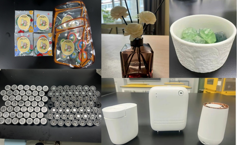 图三.实践团研发的空间趋避产品组图(从上至下依次为:爆珠驱蚊贴、车载香薰、室内香薰、香薰机、扩香石)
