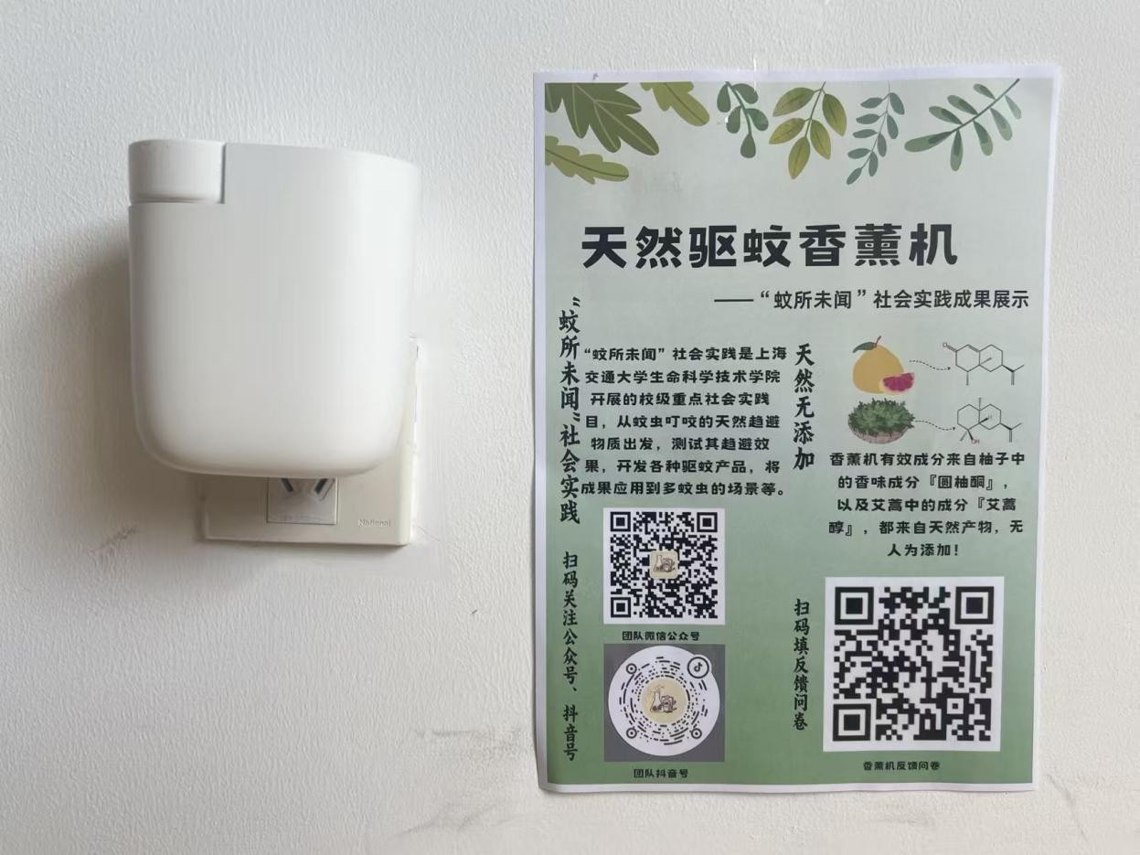 上海交通大学“蚊所未闻”暑期社会实践项系学校2025年暑期社会实践重点项目,该项目由我院刘然老师、院团委书记陈星宇老师共同指导。团队以圆柚酮、艾蒿醇两种天然驱虫原料为核心,采用“实验室探究-成员属地推广-极端场景测试”三级递进实验模式,自主研发多种新型空间趋避产品,并系统分析其在不同环境下的驱避率、持续时效、人群满意度等关键指标,全面评估实际效果。