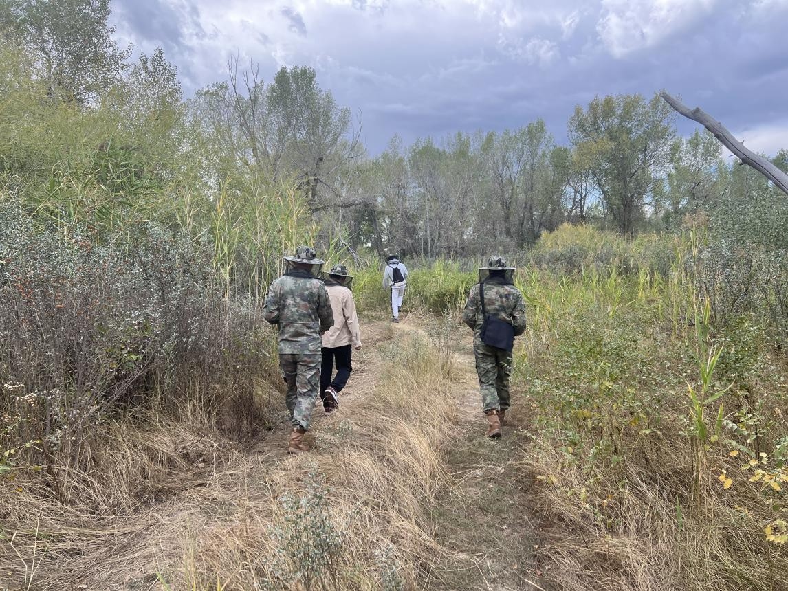 图八.实践团成员在新疆北湾实地测试爆珠驱蚊贴效果