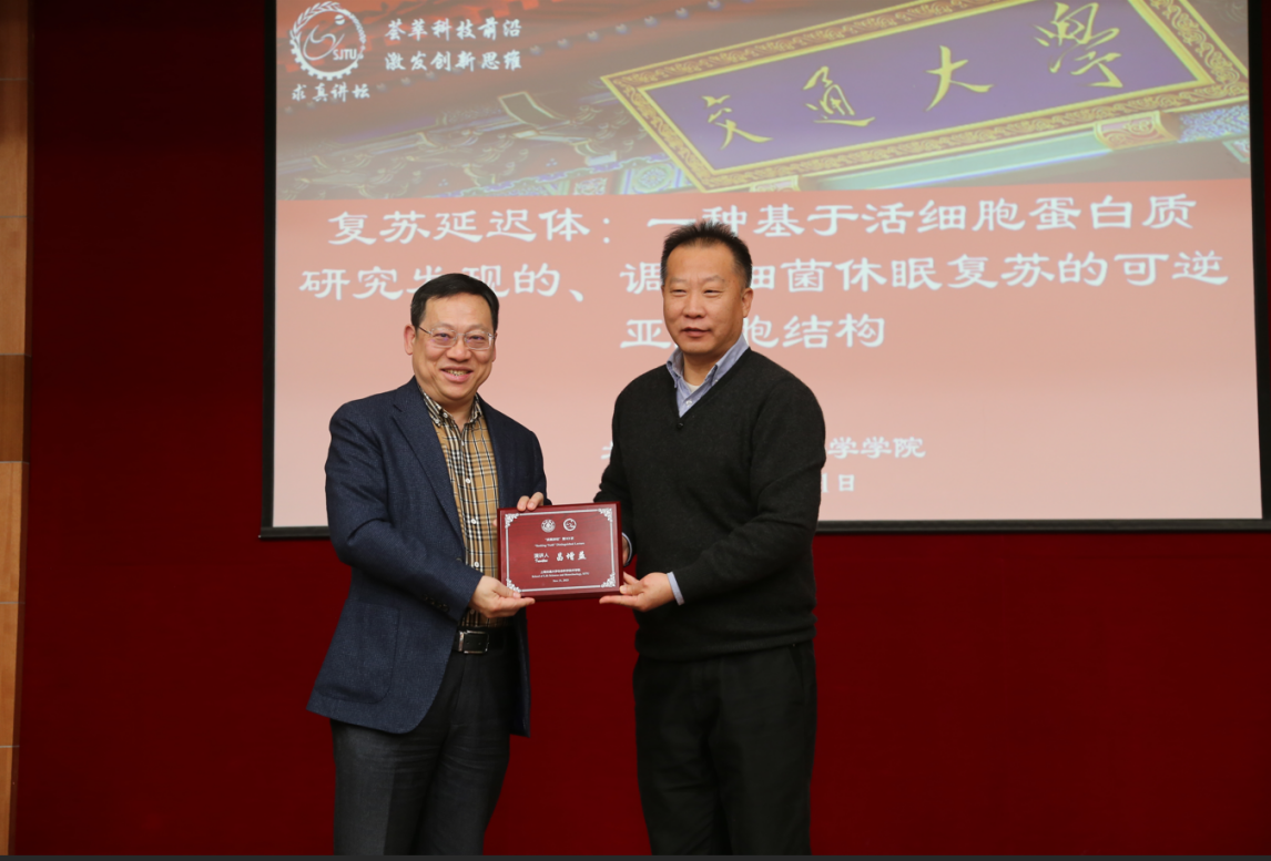 11月21日上午,北京大学生命科学学院昌增益教授应邀做客我院第63期求真讲坛,做题为《复苏延迟体:一种基于活细胞蛋白质研究发现的、调控细菌休眠复苏的可逆亚细胞结构》的主题报告。来自上海交通大学生命学科相关院系的教师、博士后、研究生50余人参会。讲坛由我院特聘教授冯雁主持。