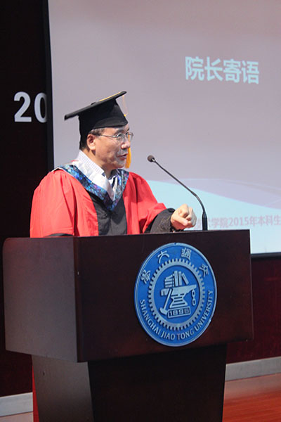 邓子新代表学院向2015届本科毕业生表示衷心祝贺,并对培育他们的老师和家长们表达了诚挚的感谢。他与毕业生们共同回忆了过去四年中学院及同学们的成长点滴,并对毕业生们提出了三点期望:勇于创新、坚守梦想和常怀感恩,希望生科学子们能够以创新的思维开启下一个征程,以坚韧的品格追逐最初的梦想,以无私的气慨奉献自己的力量。